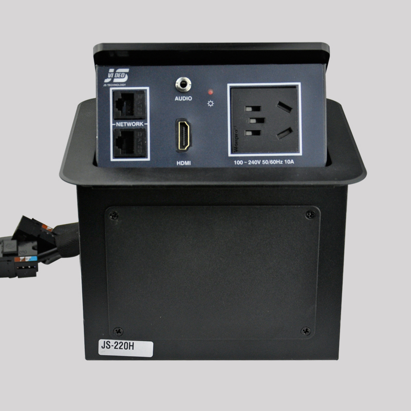 ? ? JS-2系列可藏式接線盒提供了一個整潔、緊湊、簡單的鏈接解決方案。接線盒采用氣動與機械閉鎖式結(jié)構(gòu)設(shè)計、巧妙的實現(xiàn)升起和閉合。使用時只需輕按接線盒頂部,釋放機械閉鎖,接線盒被氣動裝置順暢撐開,隱藏的電源、網(wǎng)絡(luò)、電話、視頻、音頻等各種接口即呈45°展現(xiàn)出來。使用完畢后,輕按接線盒頂部,機械閉鎖關(guān)閉,各種接口隱藏起來,隱藏后的接線盒與平臺保持水平。
