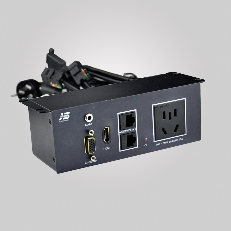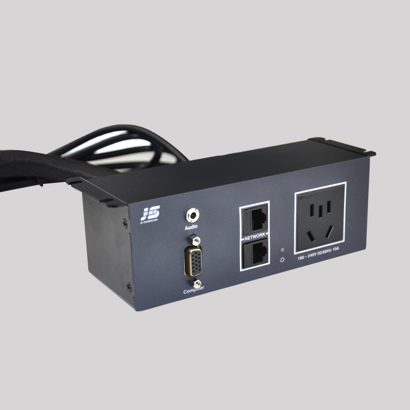 JS-Z401自收式接線盒提供了一個整潔、緊湊、簡單的連接解決方案,接線盒采用掀蓋式結(jié)構(gòu)設(shè)計,使用時掀起內(nèi)面板,各種線纜及接口展現(xiàn)出來;線纜采用自收式設(shè)計,使用時直接拉出線纜連接后即可使用,使用完畢線纜可自動收回接線盒內(nèi),實現(xiàn)了開會簡單入手、閉會就走,使整個會議桌面整潔、有序。