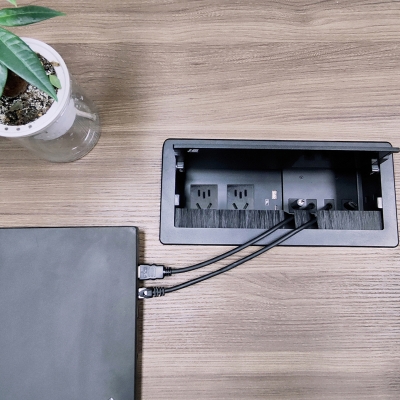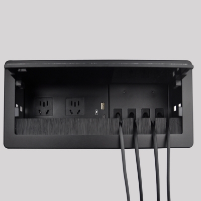 JS-Z400自收式接線盒提供了一個整潔、緊湊、簡單的連接解決方案,接線盒采用掀蓋式結(jié)構(gòu)設(shè)計,使用時掀起內(nèi)面板,各種線纜及接口展現(xiàn)出來;線纜采用自收式設(shè)計,使用時直接拉出線纜連接后即可使用,使用完畢線纜可自動收回接線盒內(nèi),實現(xiàn)了開會簡單入手、閉會就走,使整個會議桌面整潔、有序。